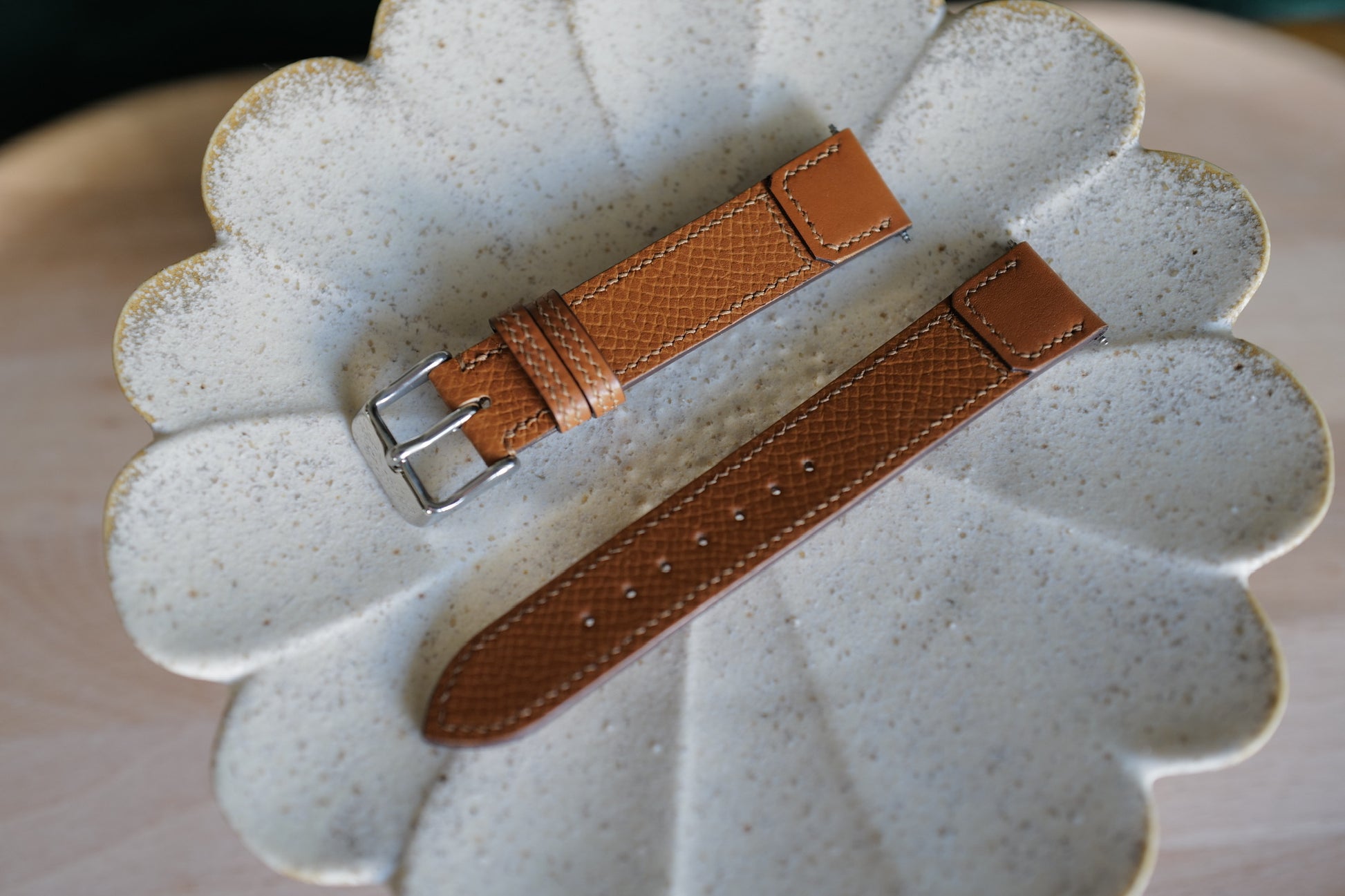 Strap Details: The strap pictured is Gold epsom leather from the Hass tannery with beige tan stitching and is tapered from 19mm to 18mm at the buckle. Thickness -2.2-2.6mm